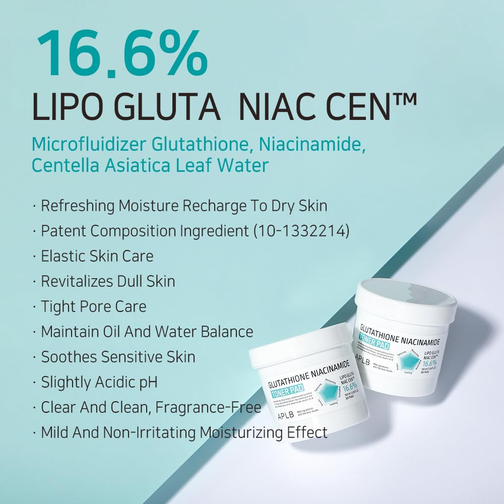 APLB Glutathione Niacinamide Toner Pad | LIPO GLUTA NIAC CEN™ 16.6% 3.38 FL.OZ/Korean Skincare, Dual Surface Toner Pads, Long Lasting moisturizing, Makeup Remover, Pore Care